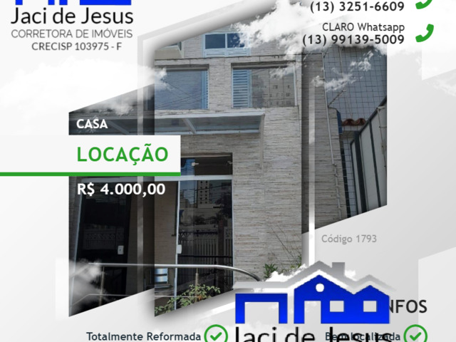 No bairro do Campo Grande em Santos/ Sobrado com uma Edícula/ tem 2 dormitórios amplos, uma sacada, sala 2 ambientes/ banheiro social/ cozinha com armários/ lavandeira, quintal lateral, um espaço para lazer, garagem para 2 carros. o terreno com 9 X 22